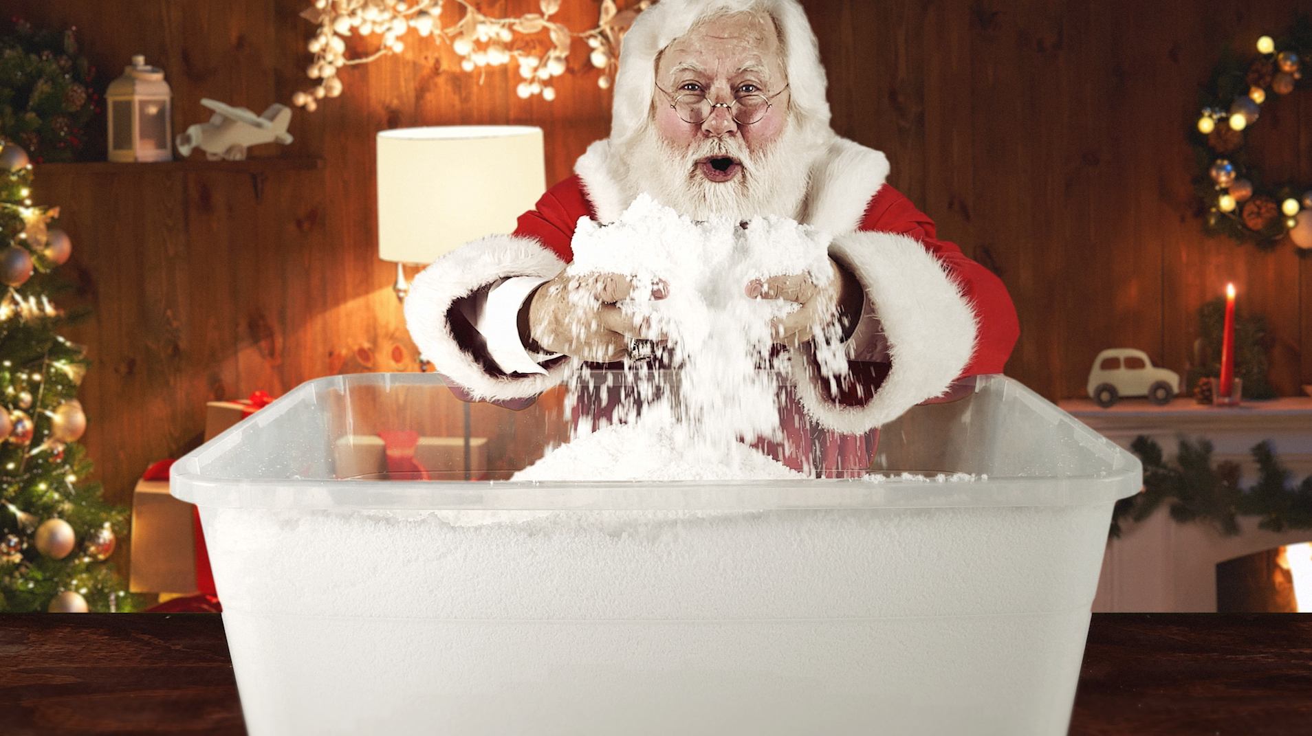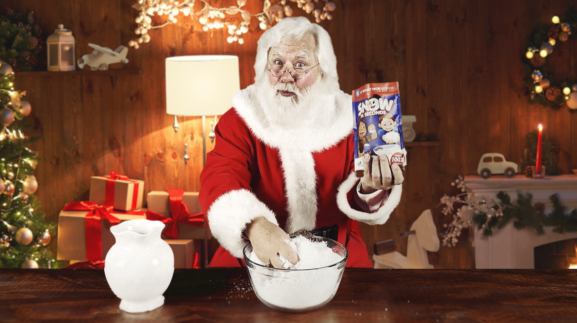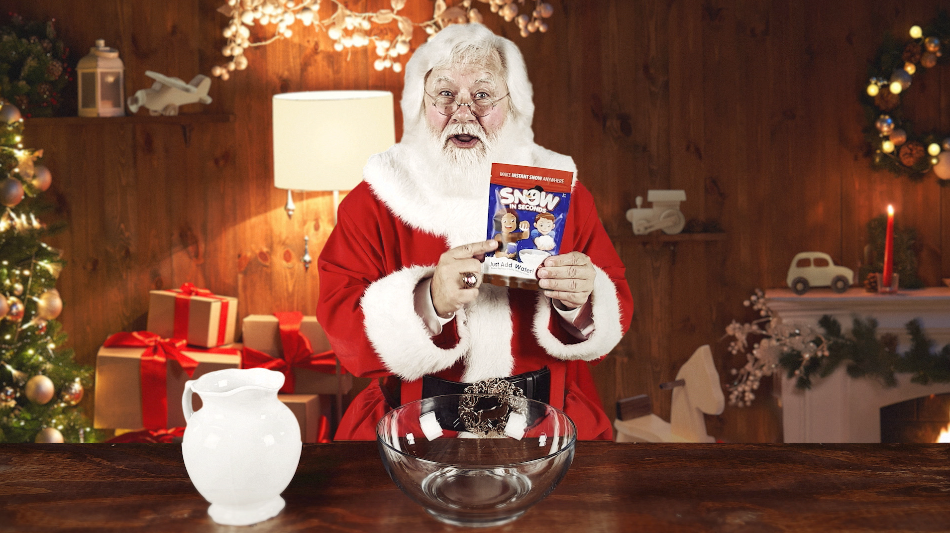 Want to make a lot of snow? Santa shows you how! Just add water and watch Snow in Seconds powder turn into fluffy white snow that looks and feels real, but never melts!